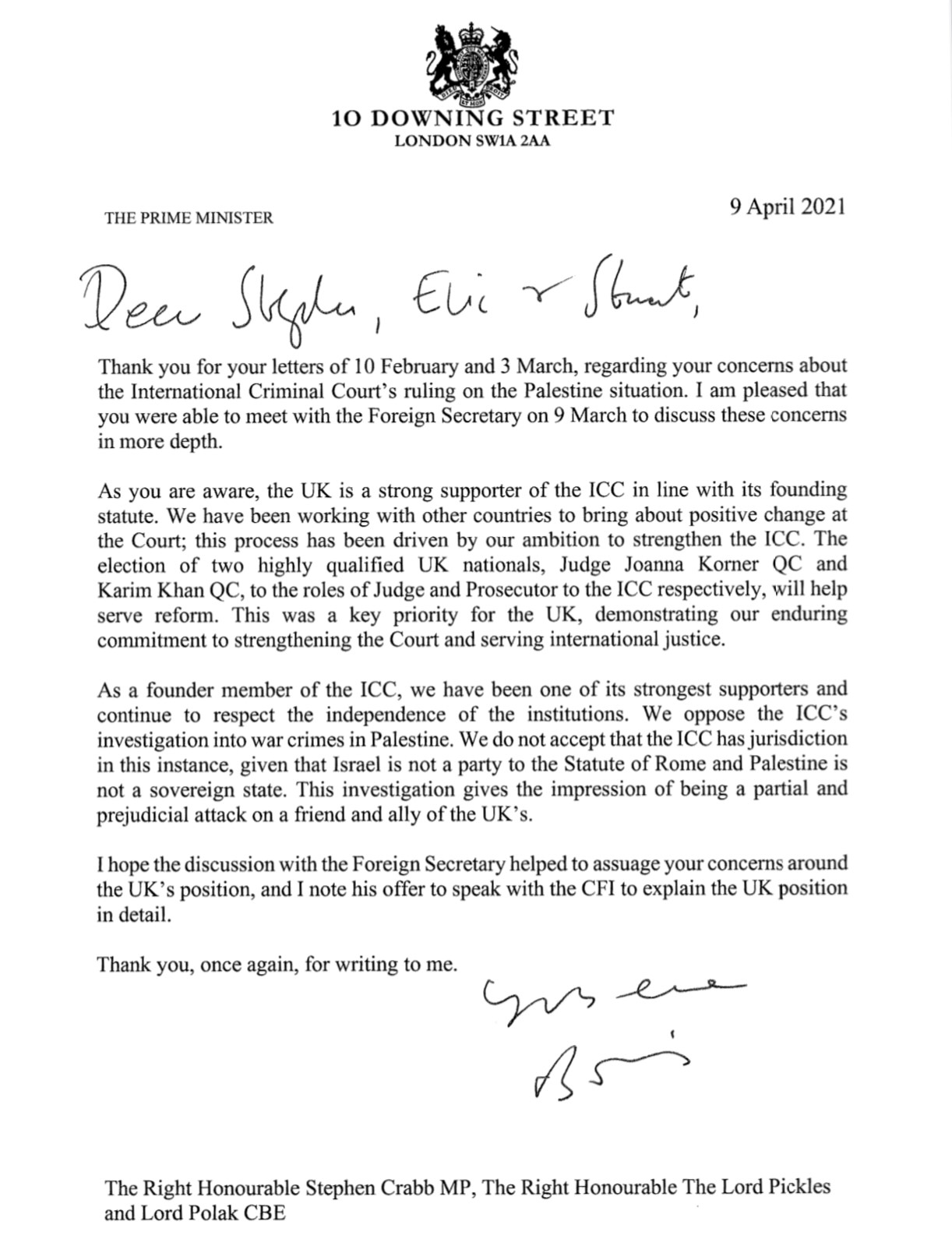 The election of two highly qualified UK nationals, Judge Joanna Korner QC and Karim Khan QC, to the roles of Judge and Prosecutor to the ICC respectively, will help serve reform. … As a founder member of the ICC, we have been one of its strongest supporters and continue to respect the independence of the institutions. We oppose the ICC’s investigation into war crimes in Palestine. We do not accept that the ICC has jurisdiction in this instance, given that Israel is not a party to the Statute of Rome and Palestine is not a sovereign state.